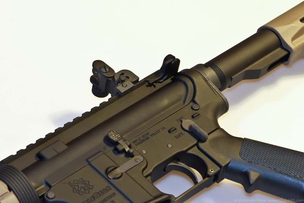 It can be configured with a 57-degree throw. The weird throw length is to ensure that it does its job of making your rifle safe when it’s on “SAFE,” while keeping the selector out of the way when it’s on “FIRE.”